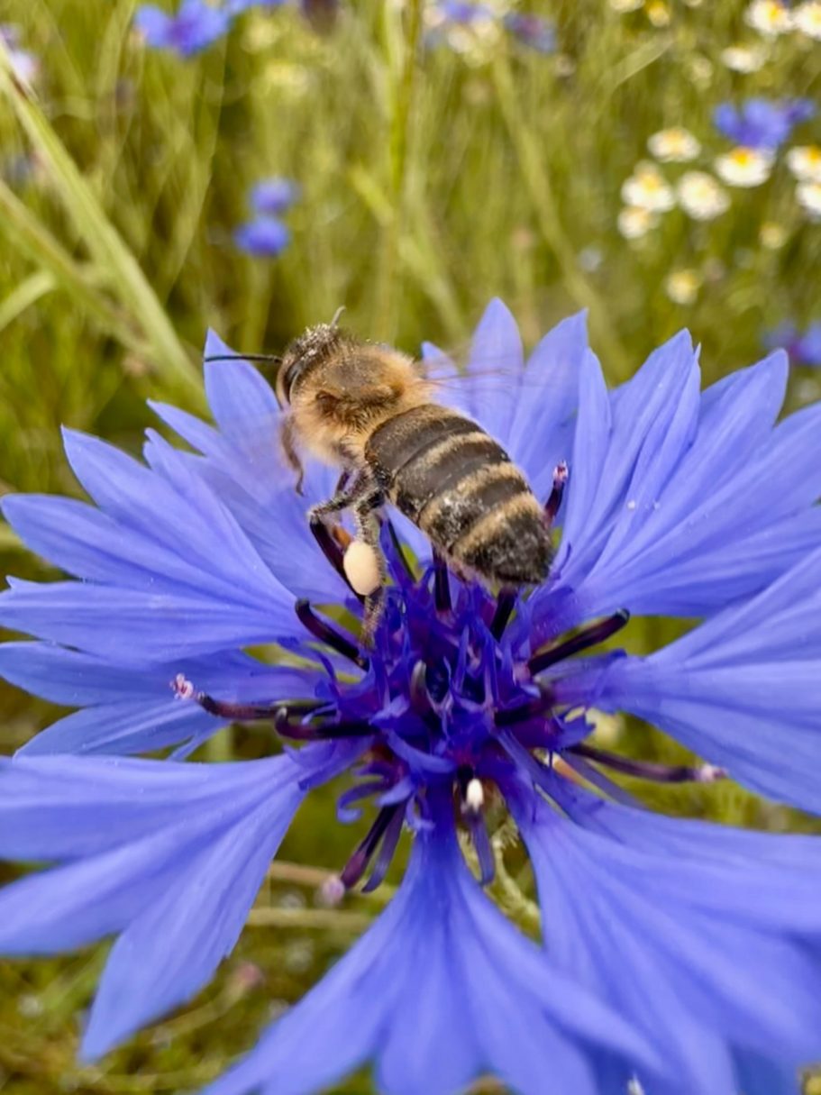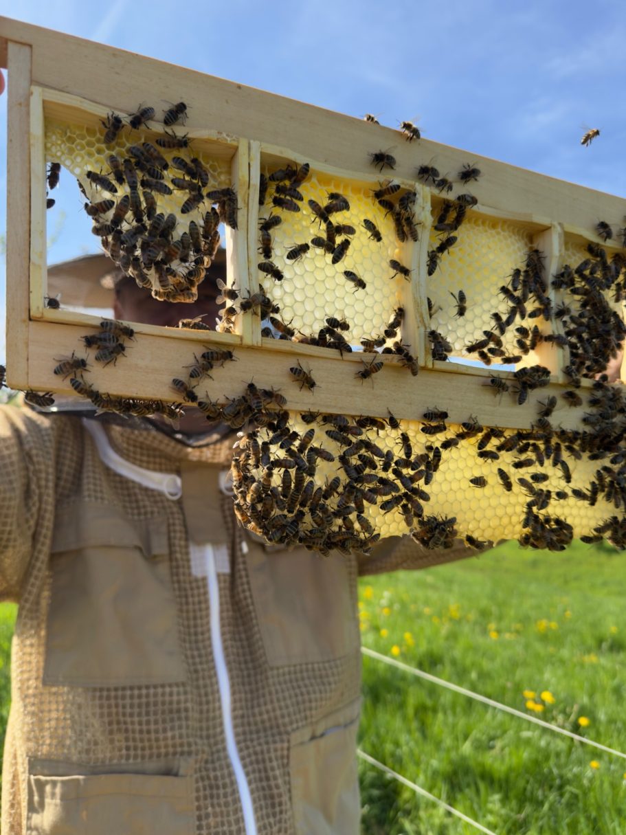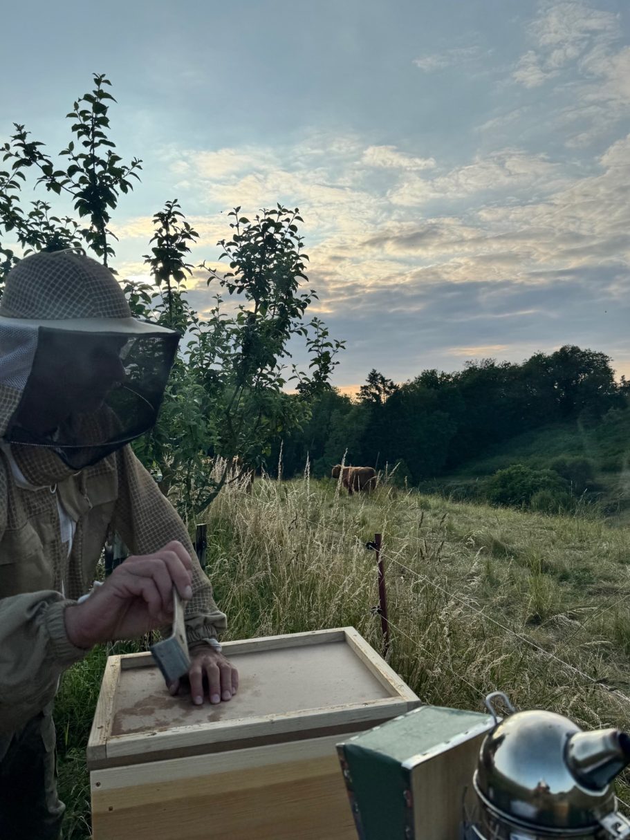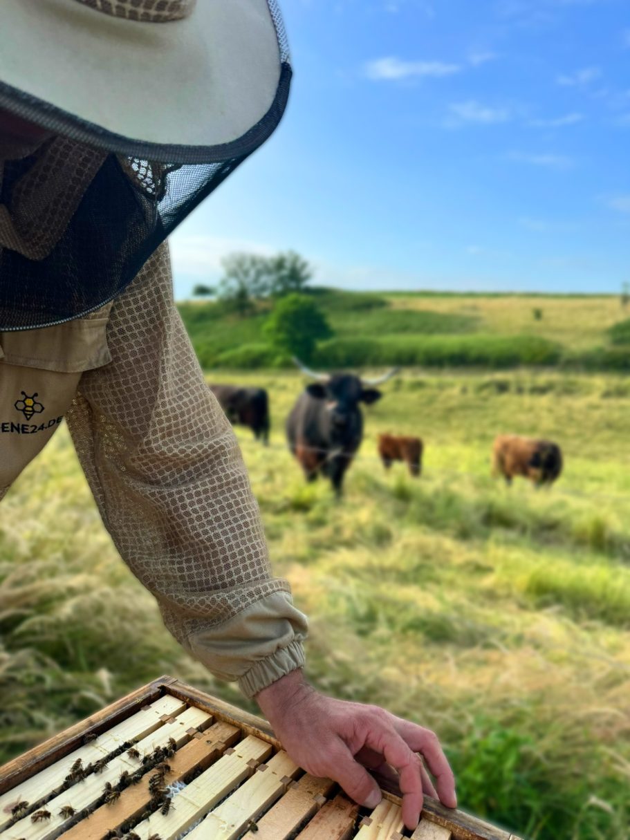 Unsere Rinder pflegen die Weiden, sodass wertvolle Kräuter und Blumen wachsen, aus denen unsere Bienen Nektar sammeln. Sie bestäuben die Pflanzen, halten die Natur lebendig – und verwandeln mit ihren Fleiß den Nekatar in unseren Honig. So entsteht ein kleiner Kreislauf, in dem alles miteinander verbunden ist und man die Natur mit jedem Löffel schmeckt.